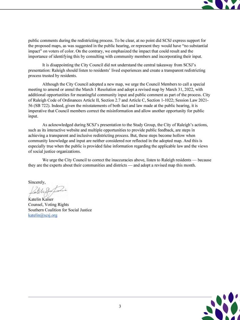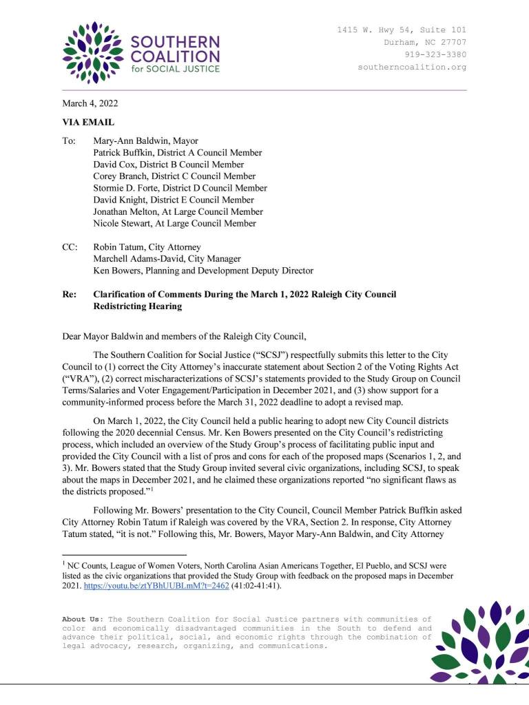 In Raleigh, a key issue is the movement of majority minority (60% or more Black and Hispanic) neighborhoods to white districts, which could dilute the racial minority vote. Residents have opposed these changes and organizations like the Southern Coalition for Social Justice have raised concern. The Coalition recommends a community-informed process that adheres to the Voting Rights Act (legally required) to revise maps. We need a transparent re-districting process that residents can trust.