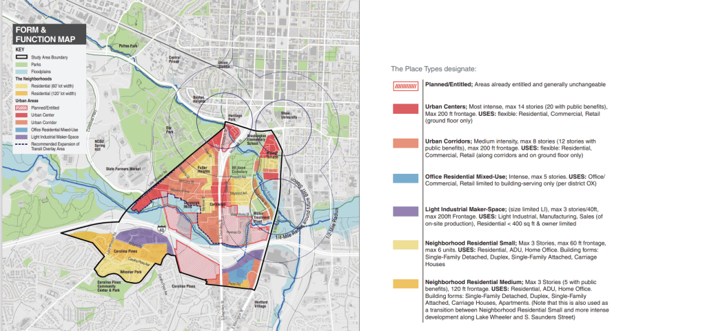 The Dix Edge area study, which city council adopted last month, envisions this area as urban center (up to 20 stories with public benefits) and urban corridor (up to 12 stories with public benefits) with flexible uses. See the map below for form and function details.