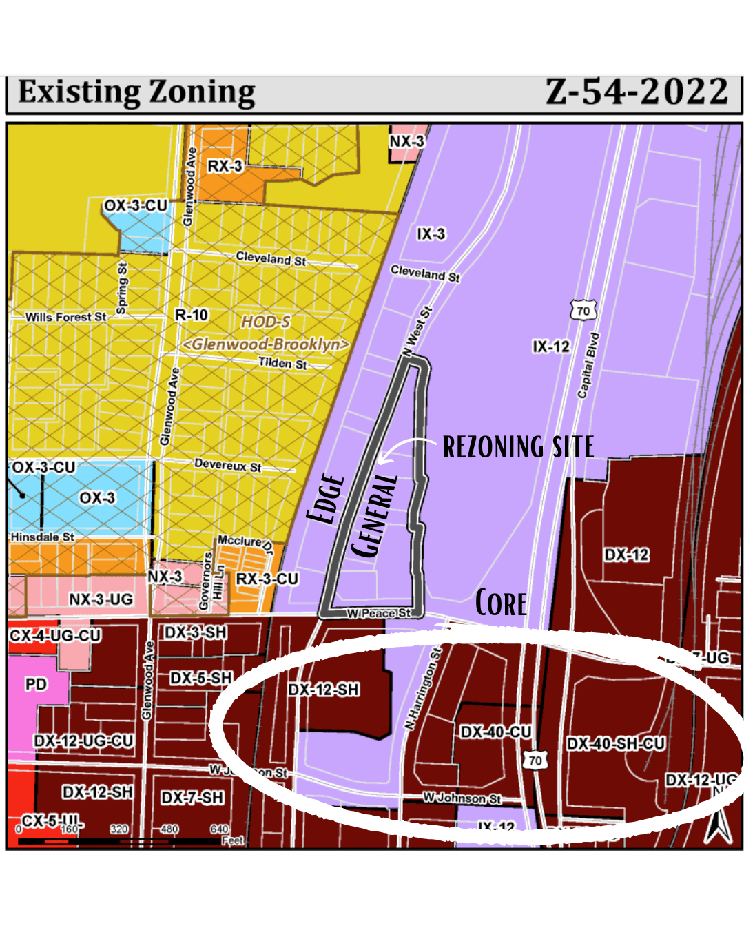 This site (2.6 acres) is just north of Peace Street, on the east side of West St next to the planned Smoky Hollow Park. Current buildings on the site are 2 stories tall. The rezoning request was for 30 stories; its current entitlement is up to 12 stories. I motioned for this case to be denied, and denial was approved with a 6-2 vote (Baldwin & Melton in opposition).