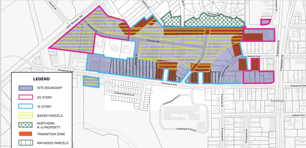 As for issues of form, neighbors adjacent to the proposed rezoning site were engaged in the rezoning process. I was happy to see that 60 feet setbacks at or below the 8th floor on the Maywood Frontage were added to ameliorate concerns regarding neighborhood transitions to Caraleigh & Caraleigh Mills. I also appreciate the neighborhood transition zone on the northside adjacent to Fuller Heights. The following map is of the approved rezoning site.